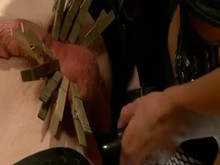 Domme Inflicts Crown Of Thorns On Impisoned Cock Of Naked Male
